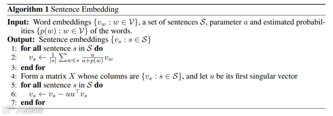 . 为了去掉与文章主题无关的c0部分, 研究建议对文章向量所组成的矩阵进行主成分分析(PCA), 将第一个主成分进行移除. 最终形成如下算法: