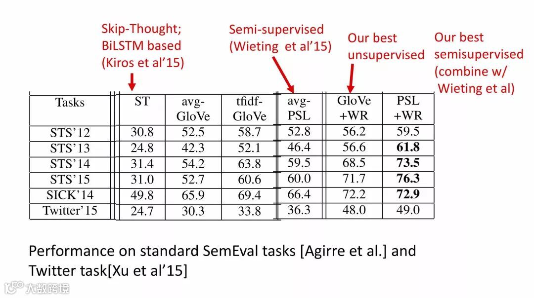 如果没有高质量与大规模的平行语料, 是不是就没有办法了呢? 普林斯顿大学Sanjay Arora教授组的研究给了一个很有意思的方案 A Simple but Tough-to-Beat Baseline for Sentence Embeddings.