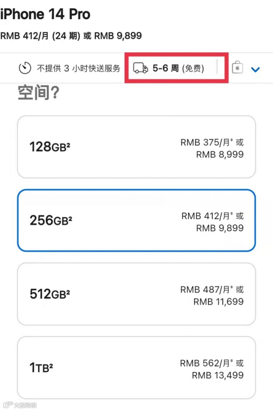 9月26日,中国证券报记者注意到,在苹果官网下单iPhone 14 Pro,收货需要等待4-5周,iPhone 14 Pro Max需要等待5-6周。而iPhone 14货源充足,在苹果官网下单有现货。