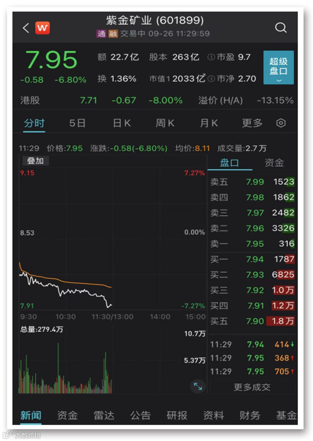 今日上午,紫金矿业下跌6.8%,最新总市值为2033亿元。