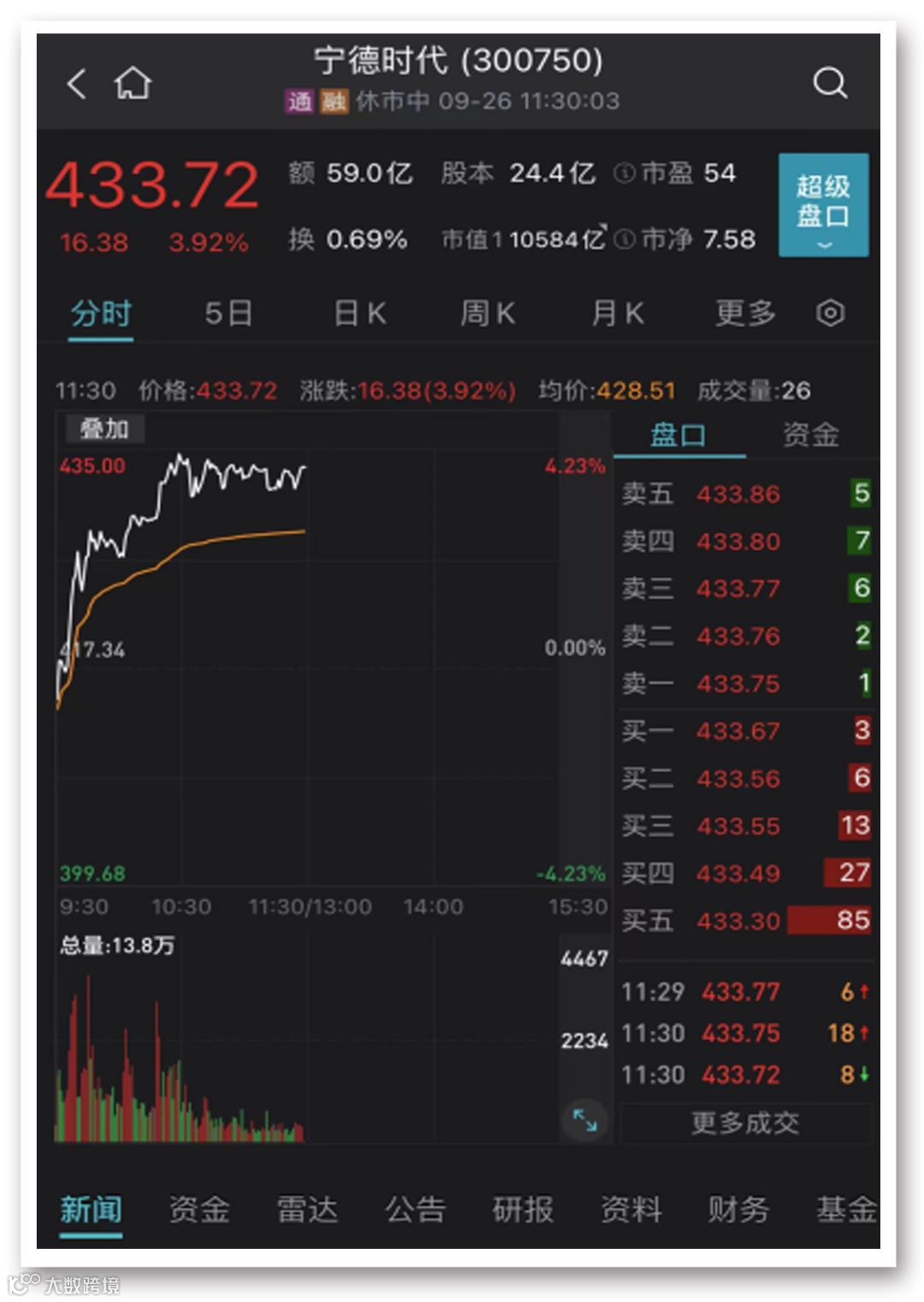 今日上午,宁德时代企稳反弹,上涨3.92%。