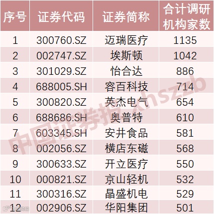 具体看,迈瑞医疗接待了1135家机构调研,埃斯顿、怡合达接待调研机构均超800家。