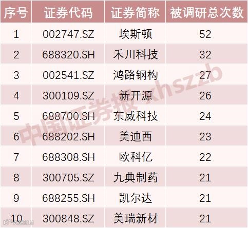 从第三季度被调研总次数来看,埃斯顿、禾川科技、鸿路钢构遥遥领先,分别被机构调研52次、32次、27次。此外,新开源、东威科技、美迪西等被调研次数超过20次。