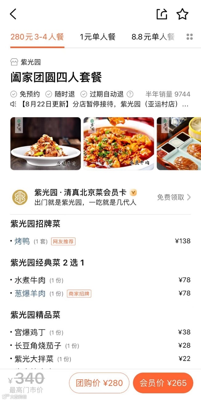 北京老字号紫光园针对中秋节上线了“阖家团圆四人套餐”