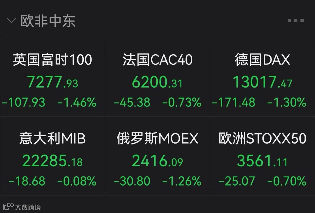 欧洲主要股指盘中下跌。截至北京时间14日21:32,英国富时100指数下跌1.46%,法国CAC40指数下跌0.73%,德国DAX指数下跌1.3%。