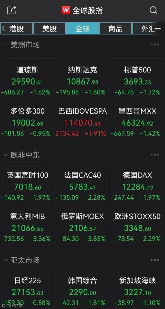 DAX指数跌1.97%,周跌3.59%。法国CAC40指数跌2.28%,周跌4.84%。英国富时100指数跌1.97%,周跌3.01%。