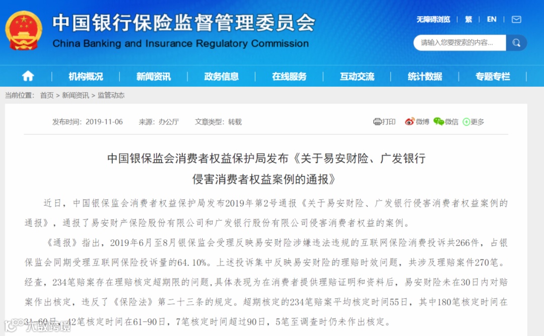 2019年11月6日,银保监会发布《关于易安保险、广发银行侵害消费者权益案例的通报》载明:2012年,广发银行根据其内部《私募股权基金(PE)代为推介合作产品方案》,在行内代为推介私募股权基金。基金于2019年8月到期,出现账目浮亏,且到期无法收回投资本金及收益的情况,引发消费者投诉。