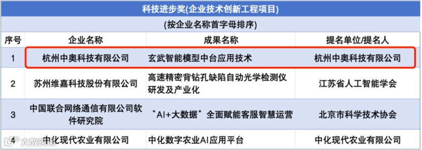 近日,中国人工智能学会公示“2023年吴文俊人工智能科学技术奖”初评通过项目名单。根据名单,共13项成果拟获自然科学奖、8项成果拟获技术发明奖 、15项拟获科技进步奖。杭州中奥科技有限公司荣获科技进步奖。