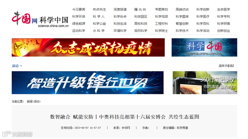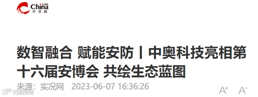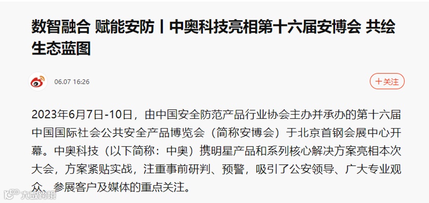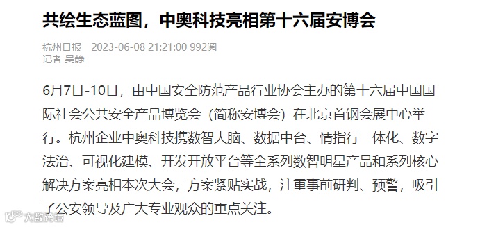 2023年6月7日-10日,为期4天的2023第十六届(2023)中国国际社会公共安全产品博览会(以下简称安博会)在北京首钢会展中心圆满落幕。杭州中奥科技有限公司(简称“中奥科技”)“重拳”出击,以“ 凝聚生态伙伴 共创数智融合生态新格局 ”为主题,盛装亮相2023安博会,得到了众多合作伙伴、相关企业的热情关注,同时受邀央视10科教频道专题采访,中国警察网、浙江日报、杭州日报、新浪等多家媒体相继报道。在此向大家表示诚挚的谢意,感谢一同见证,参与此次展会。