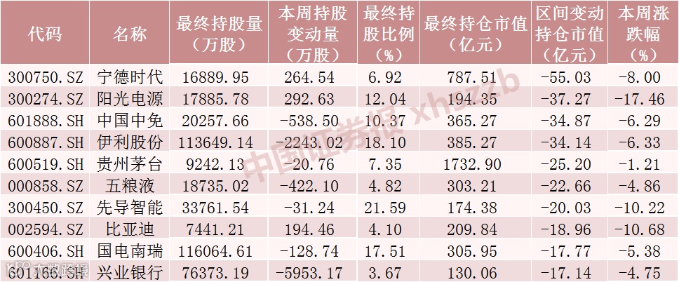 本周持仓市值减少额居前十的股票中除宁德时代、阳光电源、比亚迪被北向资金分别加仓264.54万股、292.63万股、194.46万股外,其他股票被北向资金减仓,其中伊利股份、兴业银行被北向资金减仓超2000万股。