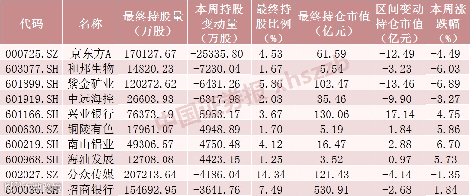 方A被减仓2.53亿股,和邦生物、紫金矿业被分别减仓7230.04万股、6431.26万股。