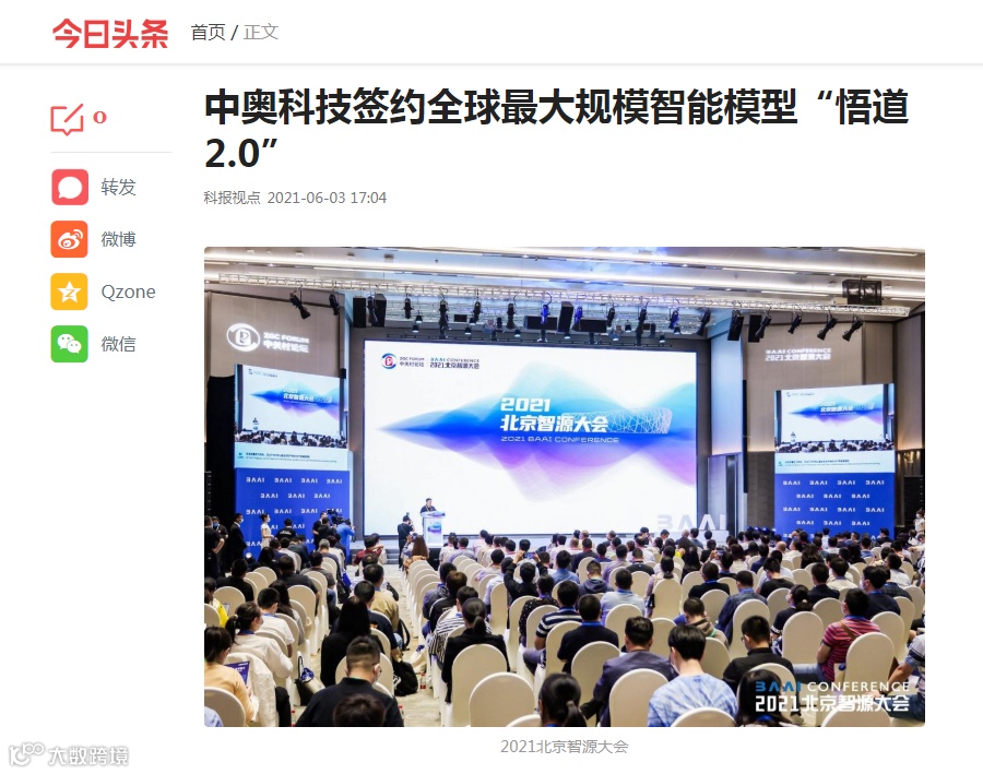 大会上发出了成立“悟道”大模型技术创新生态联盟的倡议,中奥科技也期待加入联盟,以联盟为枢纽,以企业需求为导向,推动模型研发,共同开发基于“悟道”大模型的智能应用,以模型研发和应用促进产业集聚,凝聚全球AI创新力,加速向未来!