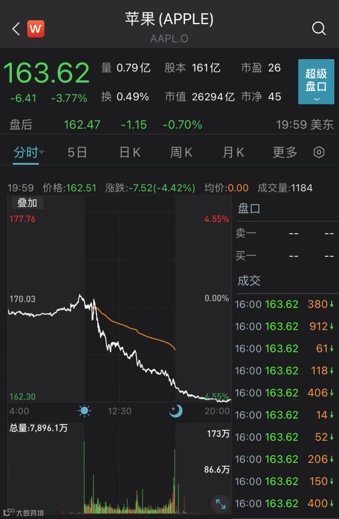 26日,苹果股价下跌近3.8%。