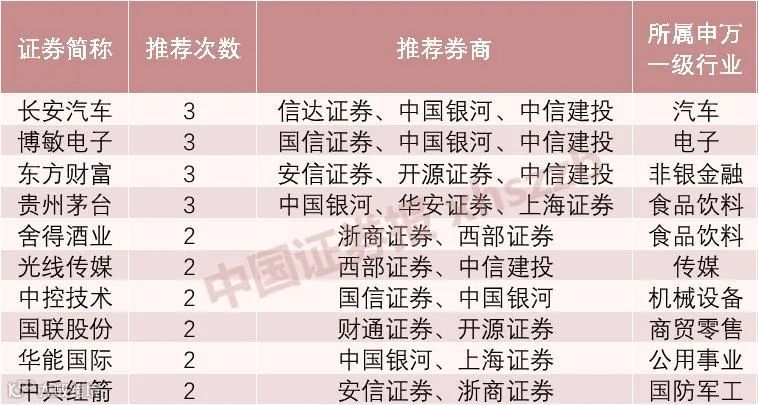 券商9月最看好的金股还有长安汽车、博敏电子、东方财富,3只个股均获得了三家券商的联合推荐,推荐券商包括信达证券、中国银河证券、中信建投证券、国信证券、安信证券、开源证券。9月获券商推荐次数居前的个股还包括舍得酒业、光线传媒、中控技术、国联股份、华能国际、中兵红箭。