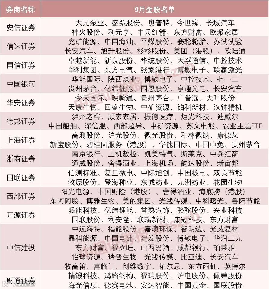 券商9月“金股”来了,这些股票被推荐次数居前(附名单)