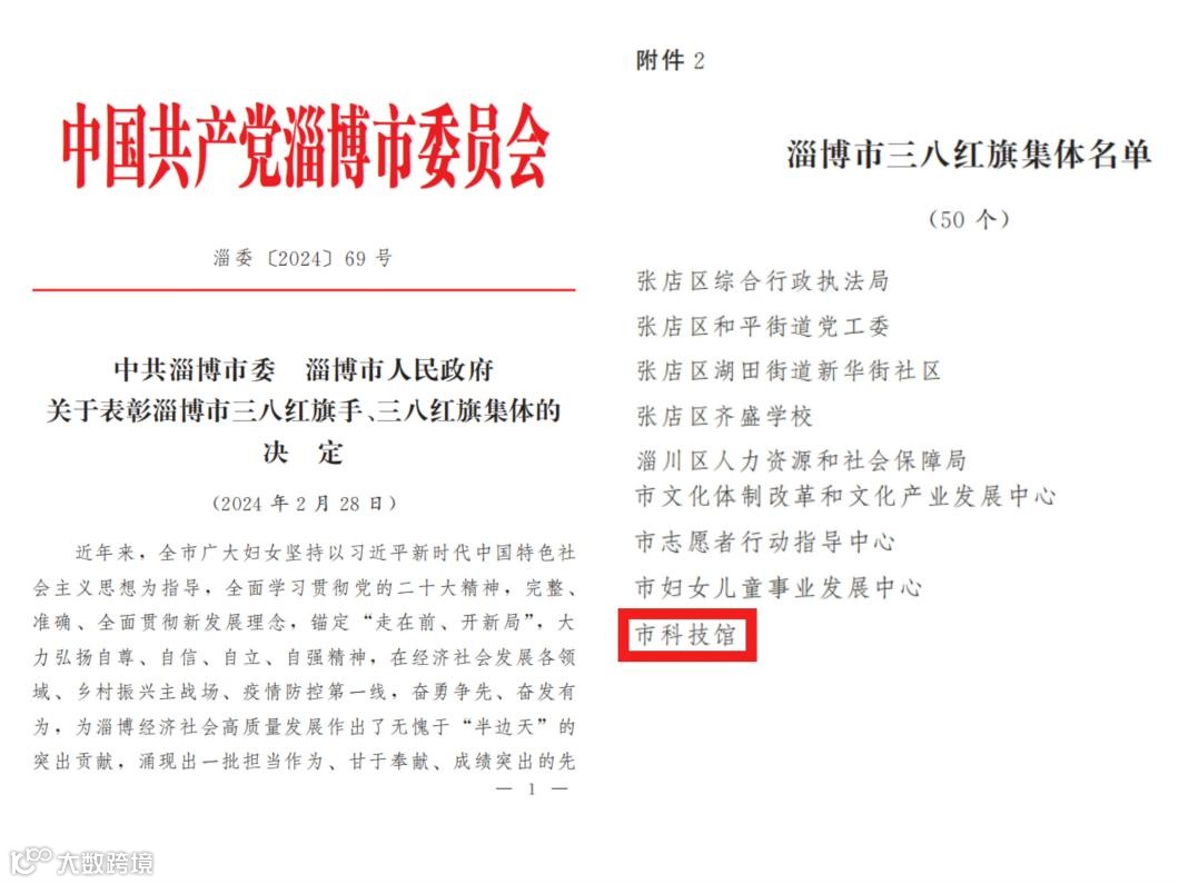 近日,中共淄博市委、淄博市人民政府联合下发《关于表彰淄博市三八红旗手、三八红旗集体的决定》,对为淄博经济社会高质量发展作出突出贡献的妇女代表及先进集体予以表彰,淄博市科技馆荣获“淄博市三八红旗集体”荣誉称号。