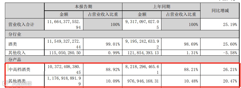 半年报显示,上半年,泸州老窖中高档酒实现营业收入103.72亿元,同比增长26.21%。中高档酒的收入占营业收入的比重由去年同期的88.21%进一步提升至88.92%;其他酒类实现营业收入11.77亿元,同比增长20.47%。