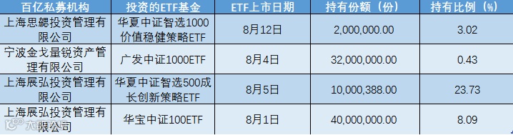 中国证券报记者还发现,在入局新发ETF基金的私募机构中,还出现了不少百亿私募的身影。公开信息显示,上海思勰投资近期成为了华夏中证智选1000价值稳健策略ETF的前十大持有人,持有比例为3.02%;宁波金戈量锐近期上榜了广发中证1000ETF的前十大持有人名单,持有比例为0.43%;上海展弘投资近期重点投资了华夏中证智选500成长创新策略ETF和华宝中证100ETF两只公募基金,持有比例分别达到了23.73%和8.09%。