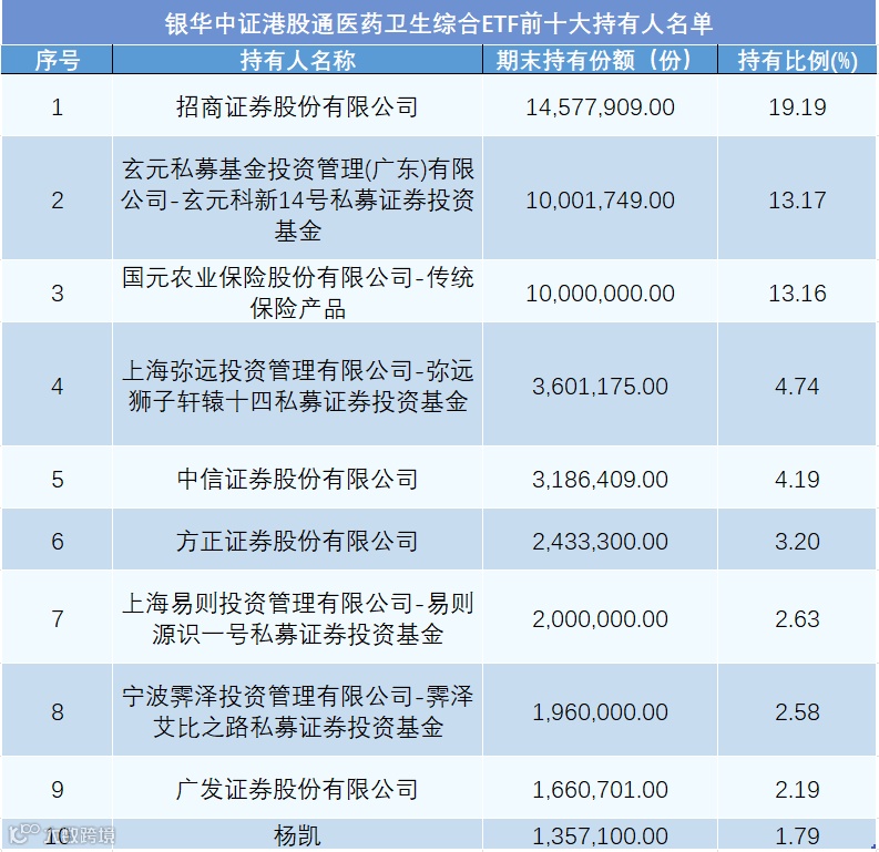 此外,记者梳理了部分今年上市的ETF基金半年报发现,越来越多的私募机构加入到“炒基金”的队伍中。在银华中证港股通医药卫生综合ETF近期发布的半年报中,四家私募机构上榜前十大持股人名单,分别为玄元投资、上海弥远投资、上海易则投资和宁波霁泽投资,持有比例分别为13.17%、4.74%、2.63%和2.58%,近乎占据前十大持有人名单的“半壁江山”。