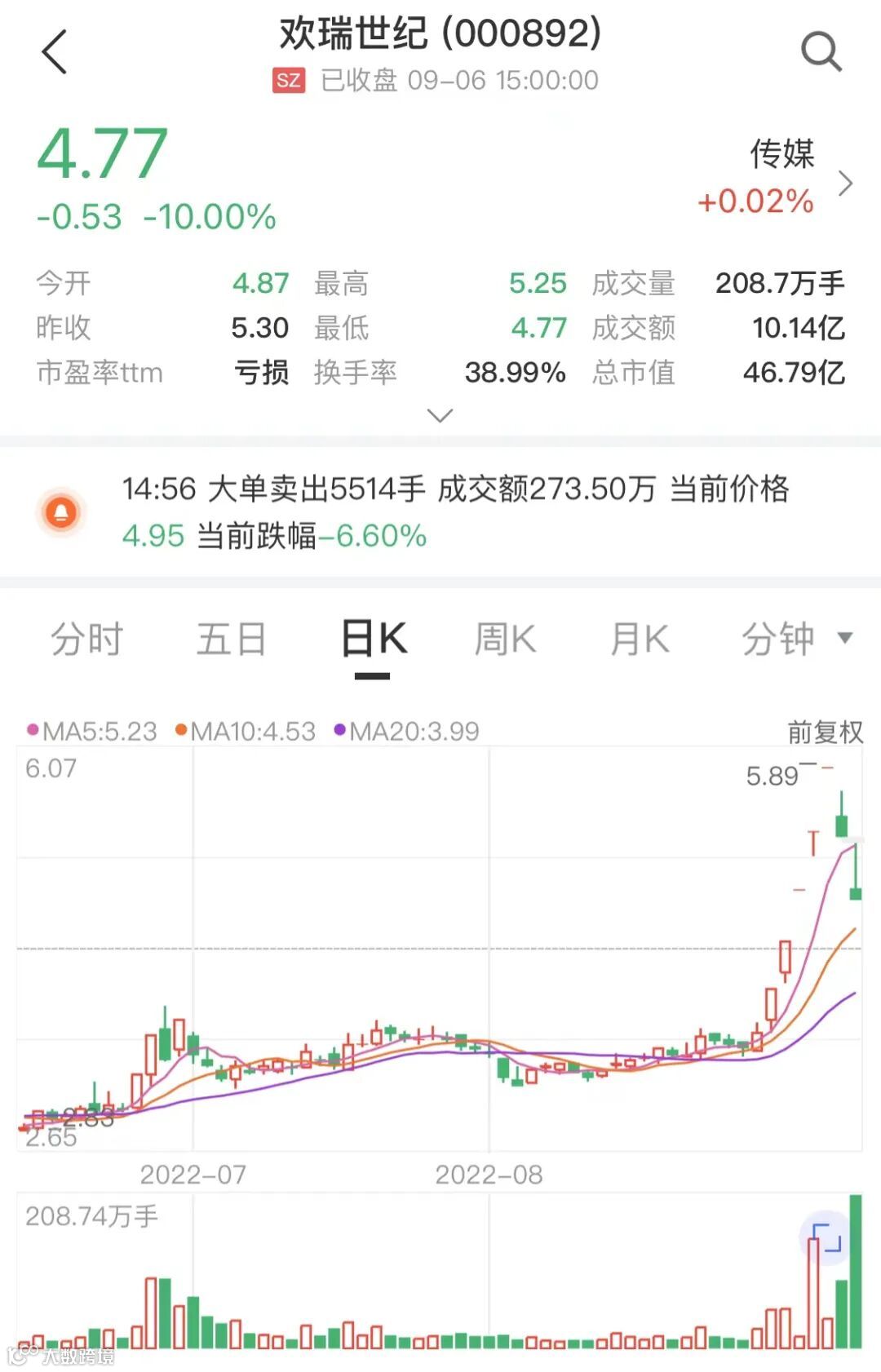 此前,欢瑞世纪因为一份增持公告收获5连板后,又因一份交易所关注函而连续两天跌停。截至9月6日收盘,公司股价报4.77元/股。