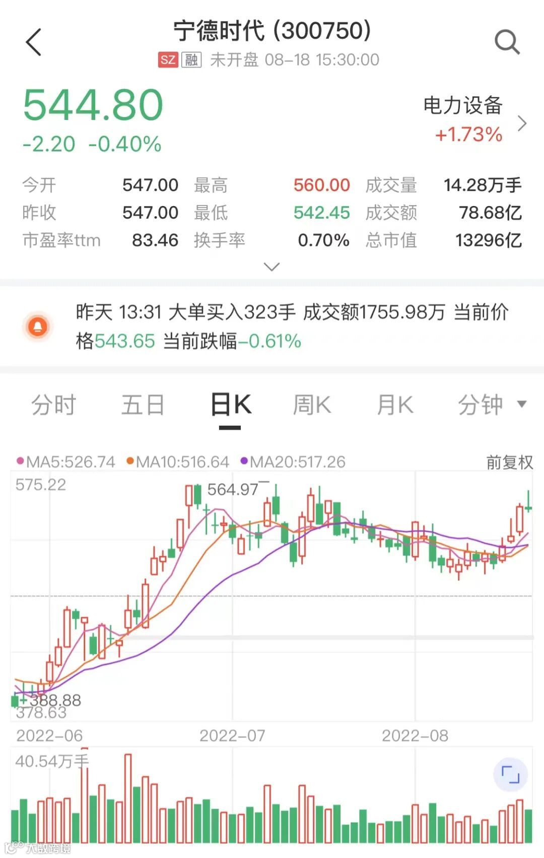 截至8月19日收盘,宁德时代报544.8元/股,跌0.4%,总市值为1.3万亿元。
