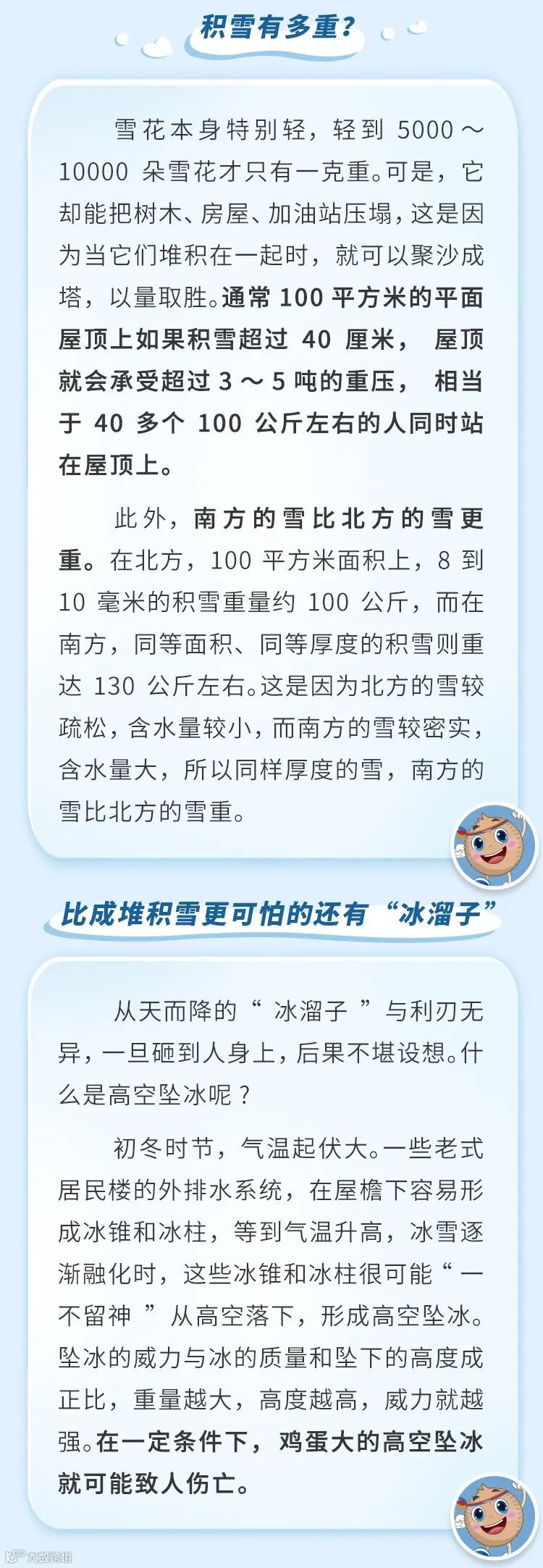 导读:雨雪天气过后,屋顶屋檐、雨棚、树枝等都可能有大量积雪、积冰,在融化过程中极易坍塌滑落,存在安全隐患。