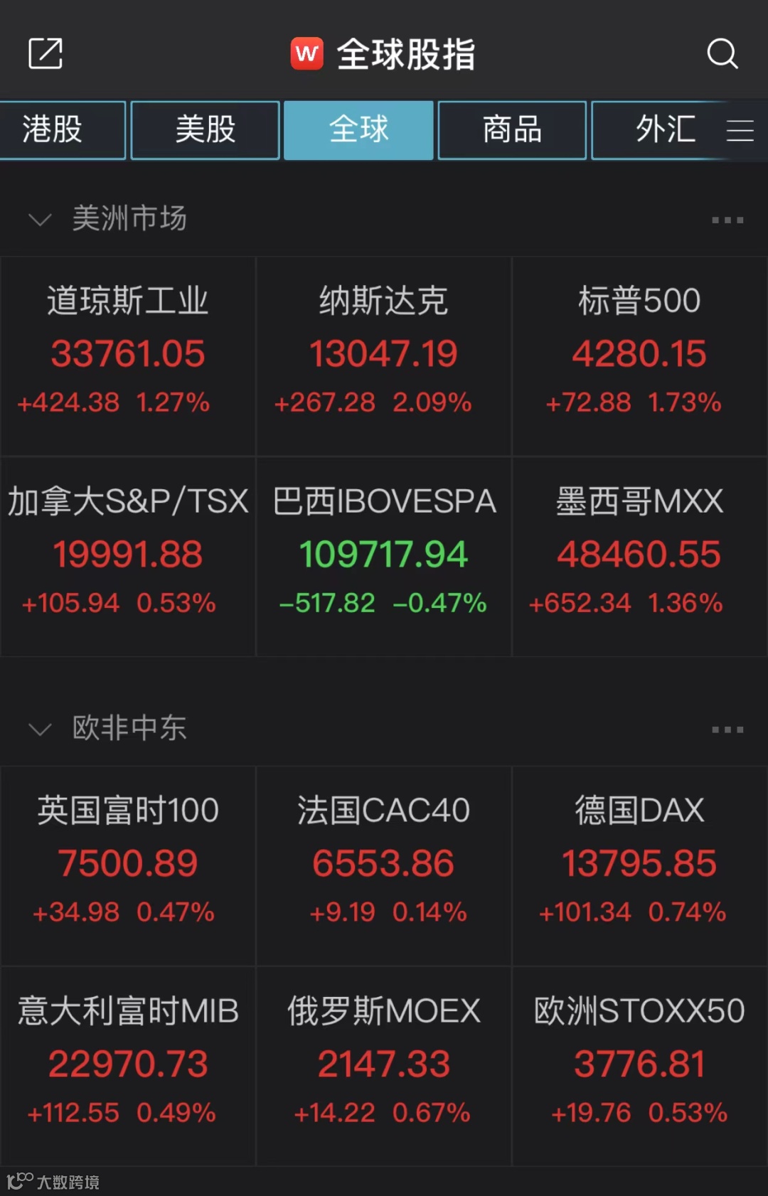 当地时间8月12日,欧洲主要股指全面反弹,德国DAX指数收涨0.74%。美股高开高走,纳斯达克指数上涨2.09%,道琼斯工业指数、标普500指数均涨逾1%,美股三大指数周线“四连涨”,并均创逾3个月新高。科技股表现亮眼,特斯拉涨逾4%。
