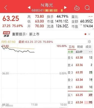 另一只新股是海光信息,上午上涨75.69%,总市值为1470.1亿元。