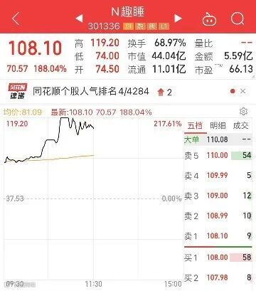 今日有两只新股上市,一只是趣睡科技,上午上涨188.04%。