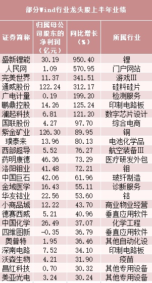 行业龙头股方面,Wind行业龙头股成分股中,有106家上市公司披露2022年半年报,有61家实现归属于上市公司股东的净利润同比增长。其中,锂行业头部公司盛新锂能、游戏行业头部公司完美世界、硅料硅片行业头部公司通威股份、检测