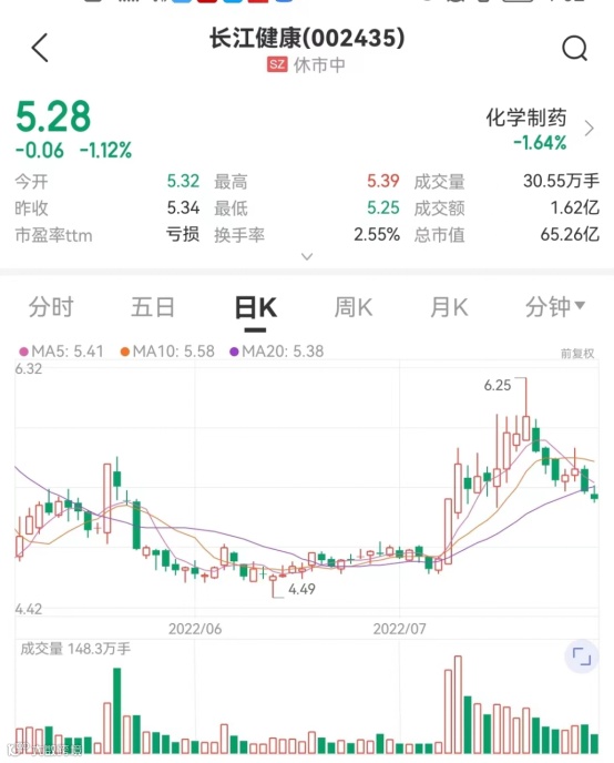 7月29日,长江健康收盘下跌1.12%,报5.28元/股,最新市值65.26亿元。按最新股价计算,上述拟减持股份市值高达8.7亿元。