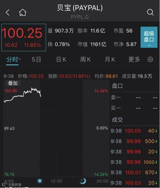 8月3日,美股开盘PayPal大涨,截至北京时间21:38,PayPal涨近12%,市值达1160亿美元,大增超120亿美元,约合人民币830亿元。