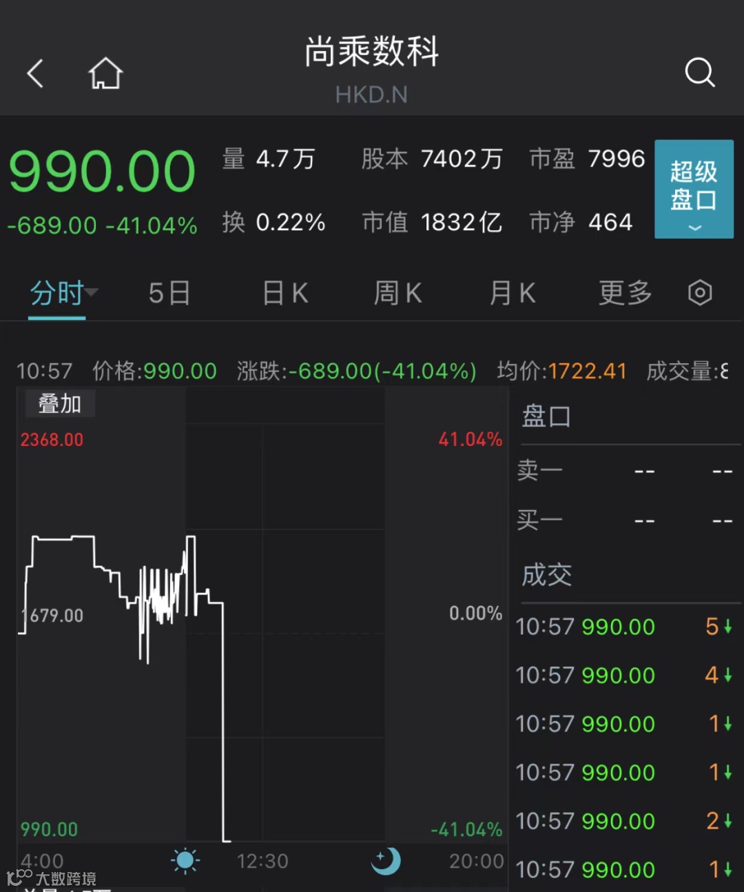 而截至北京时间22:50,尚乘数科大跌41.04%,触发熔断,市值为1832亿美元。