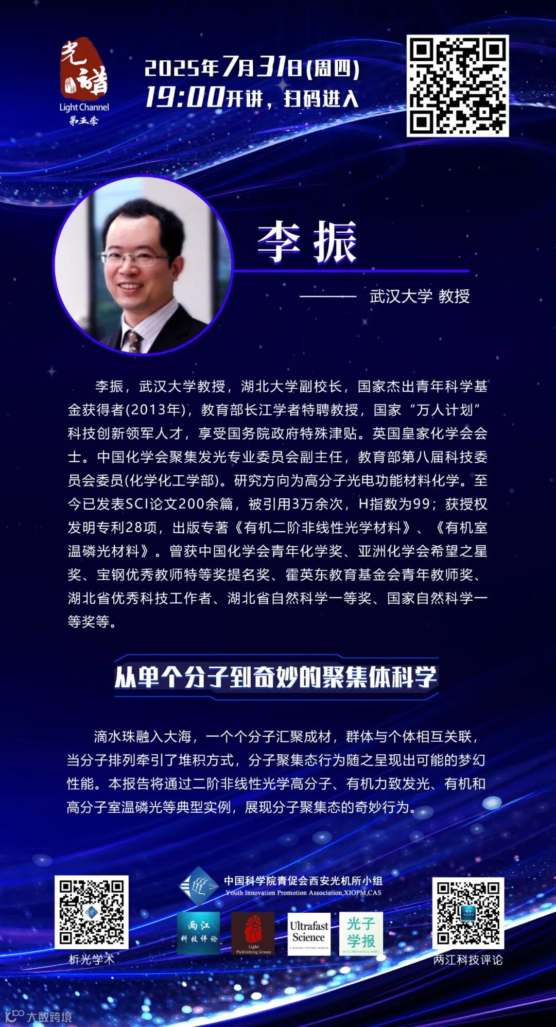 导读:7月31日(周四)晚间19: 00《从单个分子到奇妙的聚集体科学——李振》直播开讲