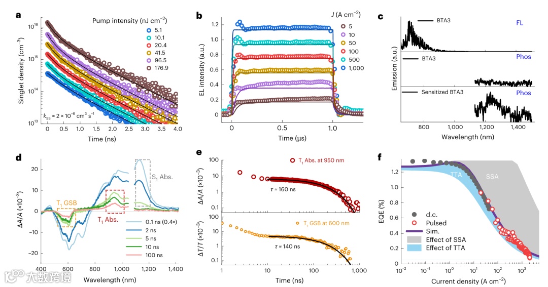 图3 | BTA3和模拟的单线态和三线态密度的放大自发辐射amplified spontaneous emission,ASE测量。