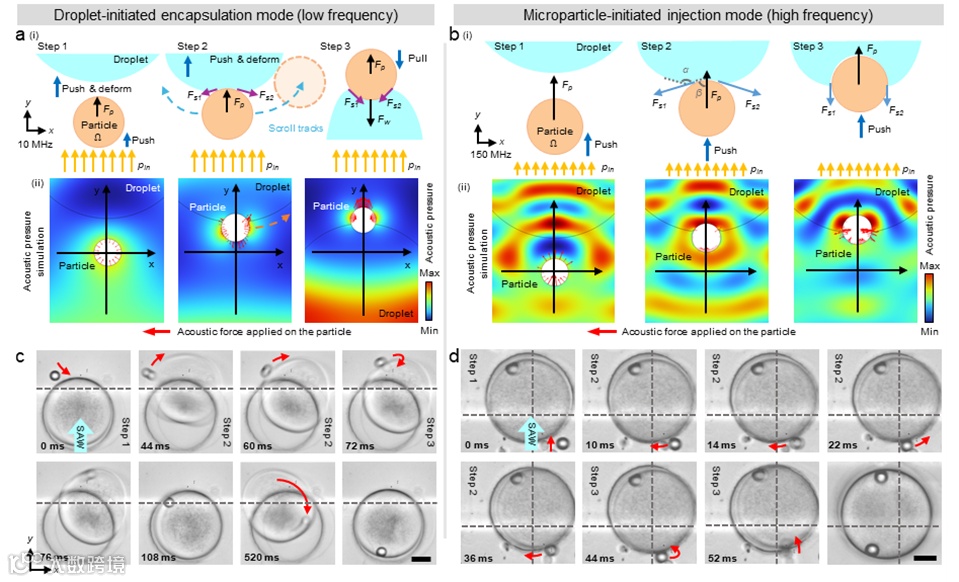 该工作深入探索了超声表面波在油水多相体系及界面的声场分布形式,揭示了颗粒嵌入的基本机理。并基于理论模型建立了高低频声波双模态驱动,实现颗粒嵌入(高频)与液滴包裹(低频)两种跨相运输机制,为人工细胞系统、药物投递、多步骤生化反应等生物医学微系统的应用开辟了新路径。研究团队实现了以下关键技术突破: