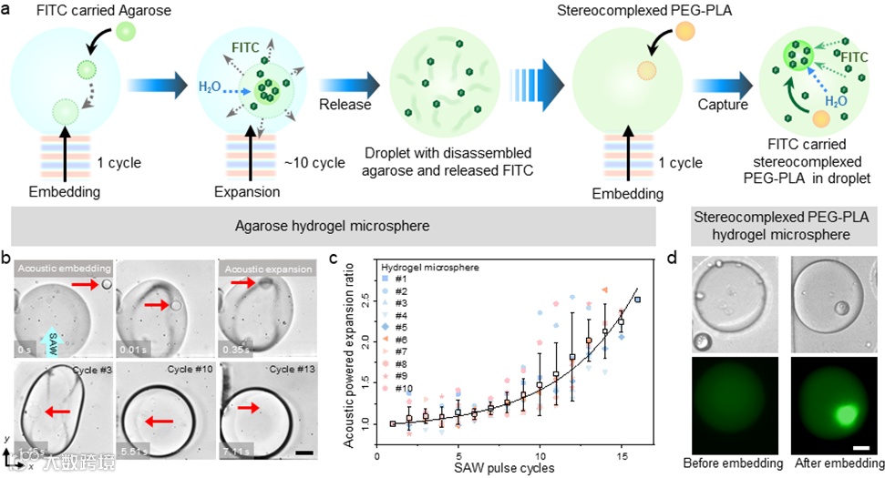 成功将10微米级别的琼脂糖(Agarose)微球在100毫秒内嵌入水相微液滴。通过继续施加声脉冲的方式,使琼脂糖在7秒内实现溶胀破裂,并将承载的纳米粒子或荧光分子释放。