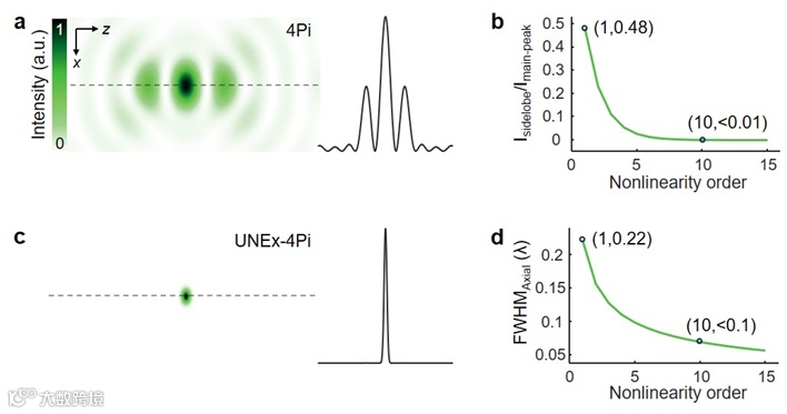 4Pi显微术能够大幅压缩物镜聚焦光斑的轴向尺寸,然而其干涉特性会导致发光中心的上下两侧产生高强度的干涉旁瓣(旁瓣强度为发光中心强度的48%,图1a)。理论计算表明,多光子激发效应可以有效抑制4Pi干涉旁瓣,当非线性(N)达到10阶时,高强度旁瓣将被完全消除(图1b)。为此,研究团队利用超高阶非线性激发(UNEx)的光子雪崩荧光(N>30),无需借助反卷积算法,首次在真实的物理空间中实现了无旁瓣的4Pi聚焦(图1c)。同时,高阶非线性效应还能在三维空间大幅压缩光斑作用尺度,轻松实现三维超分辨突破(图1d)。