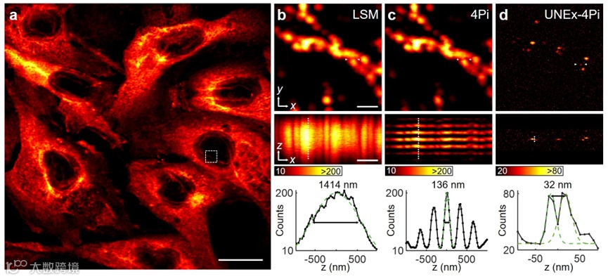图4. (a) 无光漂白的固定细胞成像;(b) 核膜结构在不同显微方法(LSM、4Pi、UNEx-4Pi)下的成像结果及分辨率对比。