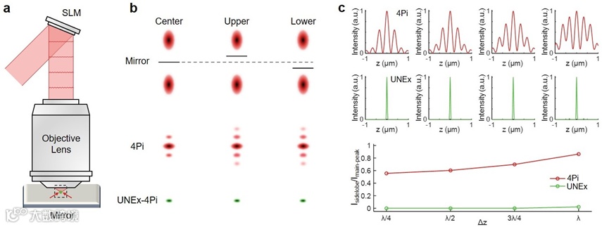 此外,针对传统双物镜4Pi架构系统复杂、稳定性差的问题,研究团队巧妙地利用反射镜替代其中一个物镜,并通过矢量光场调制沿光轴生成两个分离的焦点,经镜面反射后实现单物镜的4Pi干涉照明(图2a)。同时,实现4Pi干涉的关键在于确保两个激发焦点沿光轴的精确对准,即使是微小的对准偏差或机械抖动(100 nm),都会加剧干涉旁瓣的强度(图2b)。在当前UNEx-4Pi工作中,得益于超高阶非线性效应,该方法能够容许误差高达一个波长范围(850 nm)内,能始终保持紧凑且无旁瓣的4Pi聚焦(图2c)。