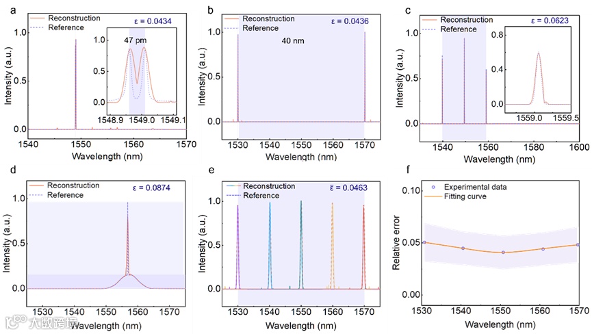 为全面评估光谱仪对任意光谱的重构性能,使用多种光谱样本进行测试。如图4 (a)所示,光谱仪成功分辨出间隔47 pm的双峰光谱,并在1530 nm至1570 nm的光谱范围内对一系列窄带光谱实现了精准重构(图4 (b))。此外,对于包含多个不同强度峰的复杂光谱(图4 (c)),以及窄带高斯峰与宽带背景的混合光谱(图4 (d)),光谱仪均能准确测量,其重建结果与商业光谱仪测得的光谱曲线高度一致,充分验证了所提出的光谱仪在高分辨率、宽光谱范围以及复杂光谱条件下的可靠性能。