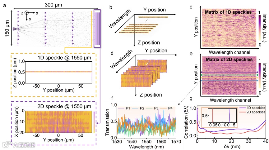 为了进一步提升散斑中的光谱信息,研究团队采用了多层级联的方法,有效提升了散斑的无序程度,如图2所示。在本研究中,散斑图样的采样方式从一维阵列波导扩展至二维空间,显著提高了光谱信息的丰富度。相较于平板波导中的一维散斑,通过光栅衍射生成的二维散斑图案能够采集两个维度上分布的光谱信息(图2 (a)),捕捉到更多的细节特征,进而提升空间分辨率和采样通道密度(图2 (b)- 图2 (e))。这种采样方式的拓展为数据处理和光谱重建提供了更为丰富的信息基础。通过采集不同波长对应的二维散斑图案,构建了一个蕴含丰富光谱信息的传输矩阵。光谱仪的分辨率可用归一化光谱相关函数进行评估,如图2 (g)所示。结果表明,相较于一维采样,二维采样预计能够大幅提升光谱仪的分辨率。