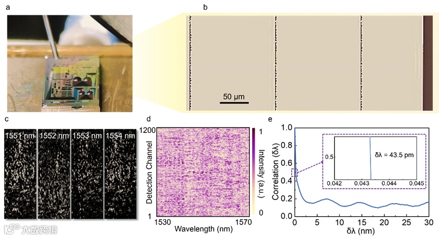 图3.光谱仪的实验表征。a) 实验设置图像。b) 设备的光学显微镜图像。c) 在输入波长分别为1551 nm、1552 nm、1553 nm和1554 nm时的测量输出散斑图案。d) 由所有通道中所有波长的测量强度组成的合并光谱-空间传递矩阵。e) 制作的光谱仪的归一化光谱相关函数。