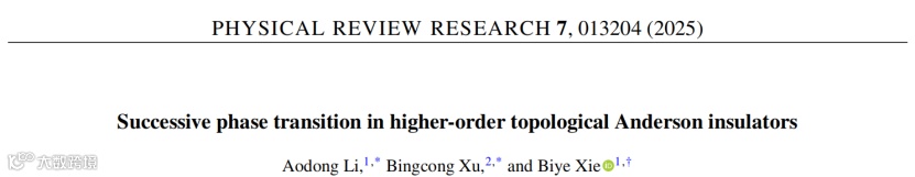 近日,香港中文大学(深圳)解碧野助理教授课题组提出了一种具有连续相变的高阶拓扑安德森绝缘体。该研究揭示了无序如何在高阶拓扑相中诱发多重相变,推动了拓扑安德森绝缘体领域发展,为利用无序调控高阶拓扑态提供了新思路。相关成果以“Successive phase transition in higher-order topological Anderson insulators” 为题发表在《Physical Review Research》上。香港中文大学(深圳)博士后李翱东为该论文的第一作者,华中科技大学博士生许冰聪为共同第一作者,香港中文大学(深圳)解碧野助理教授为通讯作者。
