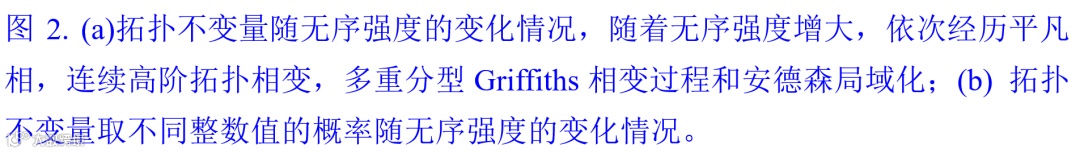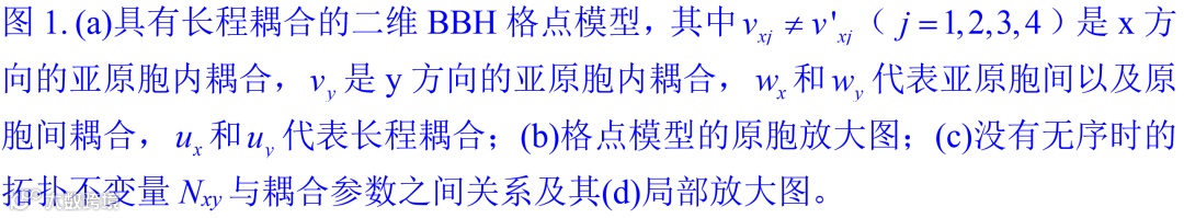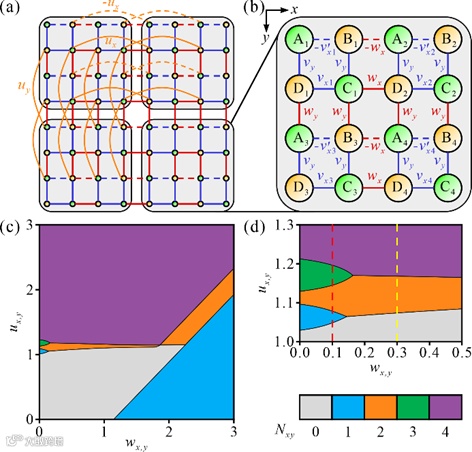我们首先定义了一个具有长程耦合的二维格点模型[如图1(a)-(b)],该模型具有手征对称性,其拓扑性质可以通过实空间拓扑不变量多极手性数Nxy描述。在该模型中,每个原胞由16个格点组成,其中每4个格点组成一个亚原胞,不同的亚原胞具有不同的胞内耦合参数。在不引入无序时,其拓扑不变量与格点间耦合参数之间的关系如图1(c)-(d)所示,表明系统可以经历多个拓扑相变。