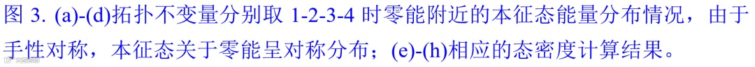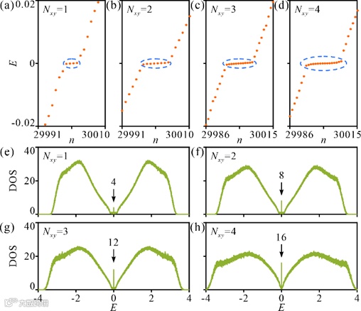 拓扑相的一个关键特点是可以预测拓扑边界态的数量。根据高阶体边对应关系,拓扑不变量的增大伴随拓扑角落态数量的增加,每个角上的拓扑态数目等于拓扑不变量。这些拓扑角落态在系统的四个角上局域化,且具有零能的特点。由于我们的二维系统有4个角,因此拓扑零能角态的数目是拓扑不变量Nxy的4倍[如图3(a)-(d)],图3(e)-(h)的态密度计算同样印证了当Nxy分别取值1、2、3、4时,拓扑零能态的数目分别为4、8、12、16个。