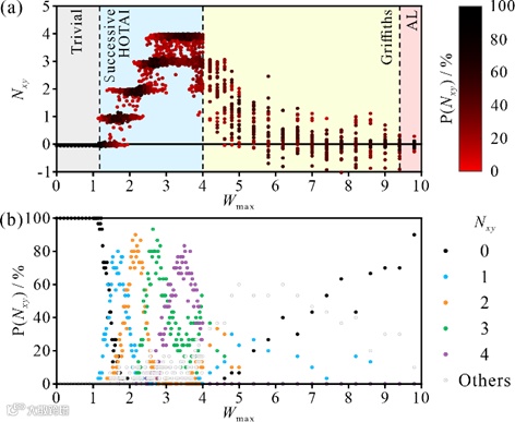 我们进一步探索了无序引入时的相变过程[如图2(a)]。当无序强度Wmax较弱时,系统处于拓扑平凡相,拓扑不变量Nxy为0;随着无序强度的增加,拓扑不变量Nxy实现0-1-2-3-4方式的连续变化,表明系统经历了多个拓扑相变;当无序强度进一步增加时,系统经历一个Nxy减小的多重分型过程,并最终到达Nxy为0的安德森局域化状态。由于无序的随机性,我们进行了多次计算,从而得到具有统计意义的结果。在该高阶拓扑安德森绝缘体中,从统计意义上讲,相变并不是随无序变化突然发生的,拓扑相变过程体现为拓扑不变量Nxy取不同整数值的概率随无序发生变化[如图2(b)]。