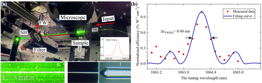 图2(a)展示的是表征周期极化TFLT波导光学性能的实验装置。基频光为连续波1064.18 nm激光器,激光器输出光谱如图3(a)插图所示。首先将近红外激光发射到光纤中,利用偏振控制器保证TE偏振输入,然后利用透镜光纤将近红外激光耦合到周期极化TFLT波导中。为了提高耦合效率,将非线性波导安装在三维纳米级调整架上进行精确对准。通过自由空间准直的透镜收集波导后面产生的SH波和剩余FW,然后用45°二向色镜分光。为了研究周期极化TFLT波导的SHG调谐曲线,使用近红外可调谐激光器,以0.1 nm步长将波长从1063 nm调谐到1065 nm,测量和拟合的波长调谐曲线如图2(b)所示。在测量SH波的输出功率之前,为了确保没有泄漏基波光,研究人员先使用高精度光谱仪记录了从二向色镜透射光的光谱线。当FW的波长设置为1064.2 nm时,二次谐波产生最大值,与固定波长1064.18 nm基本一致。测量波长接受带宽约为0.4 nm,接近理论值0.38 nm,表明在8mm长的非线性波导中具有均匀的铁电畴结构。