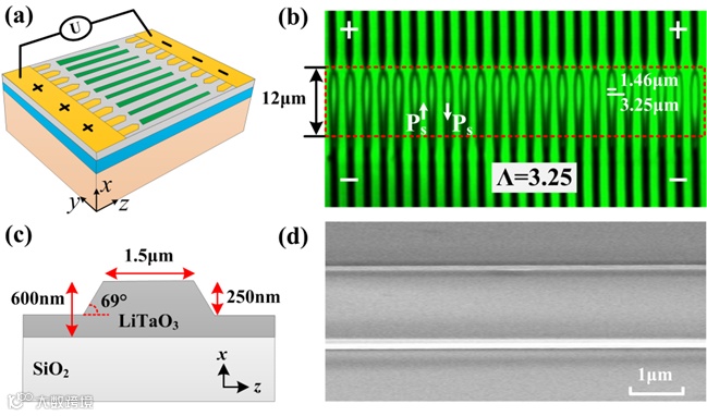 图1 (a) x切TFLT电场极化示意图。(b) 周期反转畴结构的SH共聚焦显微图像。黑色针状区域是电极,白色箭头表示自发极化的方向。(c) x切TFLT波导的示意图。(d)脊波导刻蚀后的SEM图像。