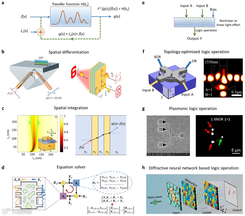 电磁数学算符。常见数学算符包括微分、积分、卷积、傅里叶变换等,在图像处理、数据建模和特征提取中发挥着重要作用。除此之外,还可以实现方程求解器,设计紧凑型超材料计算核,构成闭环电磁计算系统,求解大尺寸线性方程(图6)。